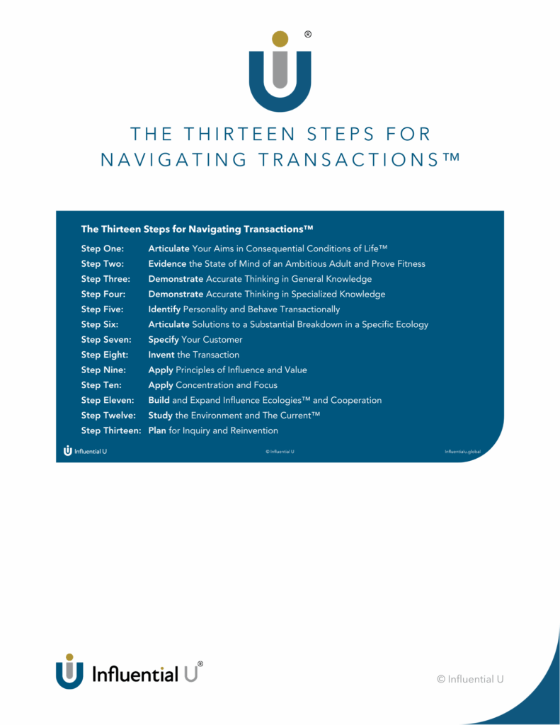 At Influential U, we offer The Thirteen Steps For Navigating Transactions™ as a framework for considering all of the unique transactions that face you each day. These steps are constitutive elements needed to effectively think through the action required to build a business or life plan that can help you reach your chief aims.